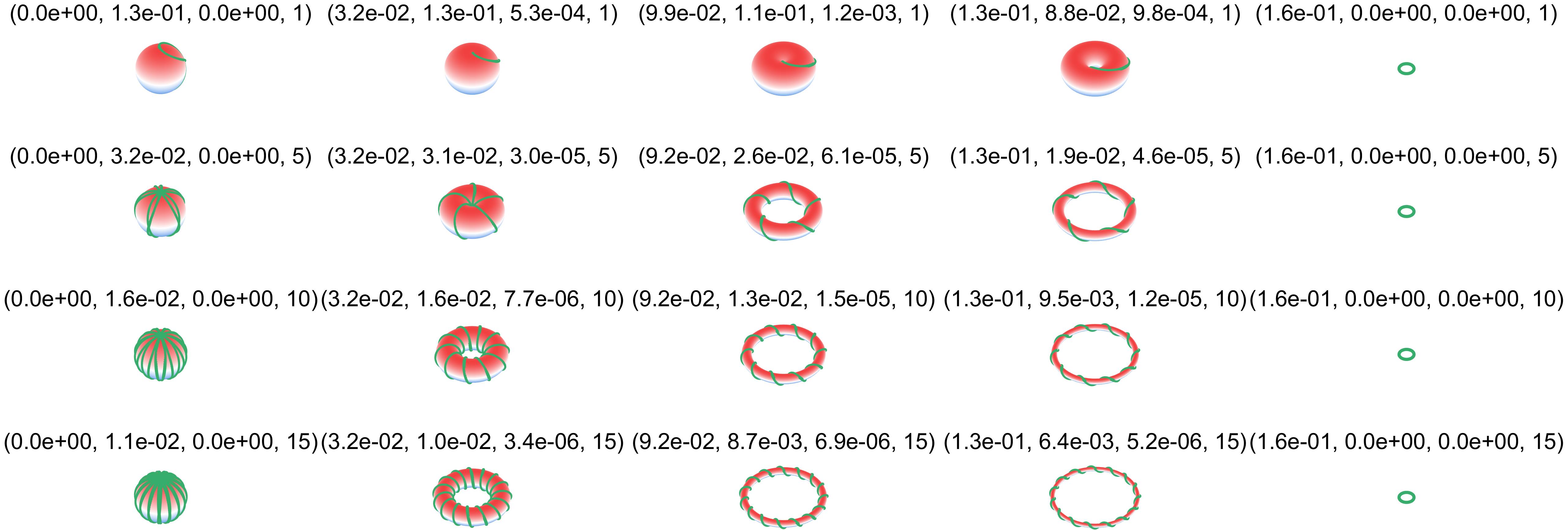 绘制不同缠绕数情况下的Torus,数组表示含义为$(R/L, r/L, Vol/L^3)$: