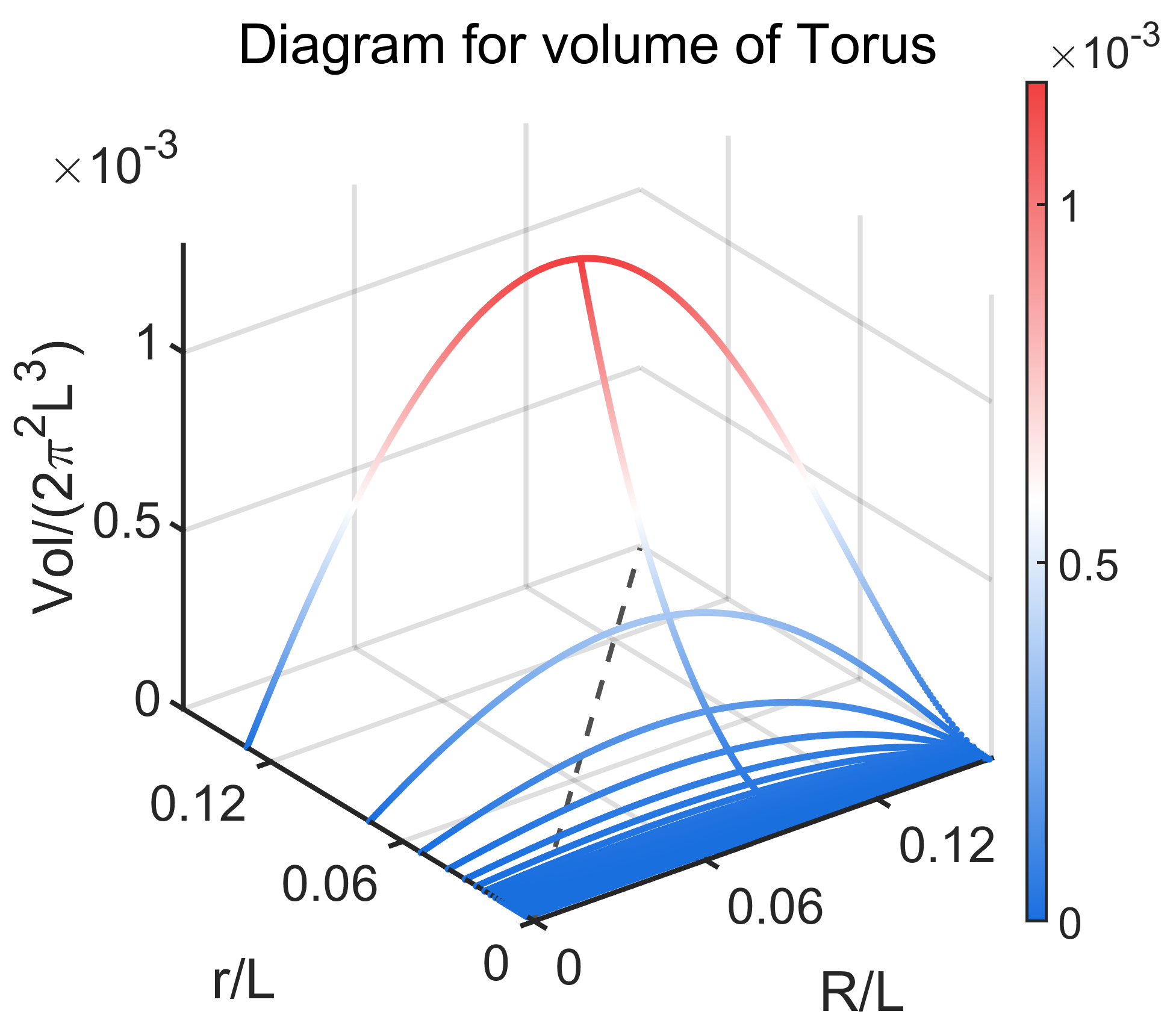 假设纤维缠绕$k$圈,纤维的参数方程可以写为: $ p(\theta)={\cos\theta (R-r \cos k\theta),\sin \theta (R-r \cos k\theta ),r \sin k\theta } $ 纤维长度可以写作: $ ds=\sqrt{k^2r^2+(R-r\cos k\theta)^2}d\theta $ 固定纤维长度,有: $ \int_0^{2\pi}\sqrt{k^2r^2+(R-r\cos k\theta)^2}d\theta=L $ Torus的体积为: $ V=2\pi^2r^2R $ 问题转化为在纤维长度$L$以及环绕圈数$k$固定的时候求体积极大值,长度用$L$,体积用$2\pi^2L^3$无量纲化,问题转化为: $ \int_0^{2\pi}\sqrt{k^2r^2+(R-r\cos k\theta)^2}d\theta=1, k=1,2,3……N